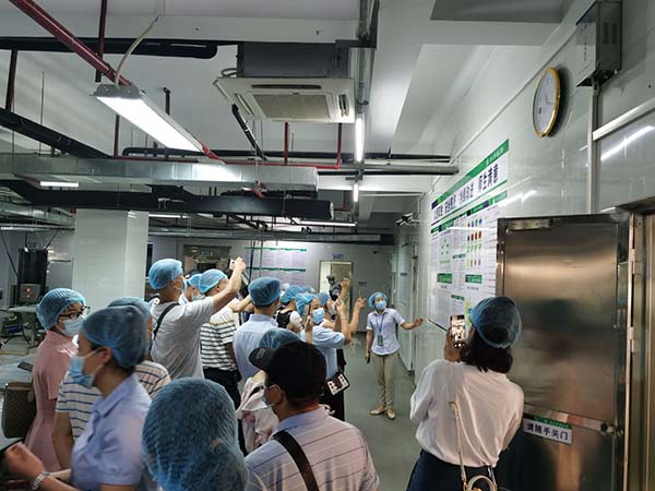 2021年7月30日上午,百色市右江區(qū)市場(chǎng)監(jiān)督管理局組織右江區(qū)部分高校和餐飲單位一行41人到我公司考察交流,在公司總經(jīng)理孔宇的陪同下分別參觀了凈菜加工中心、食品檢測(cè)室、秀苑餐廳等。