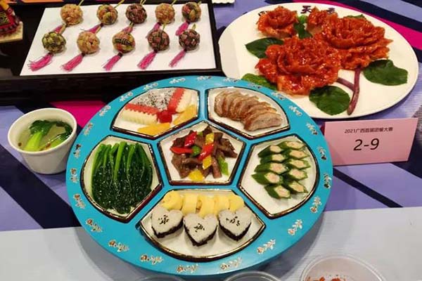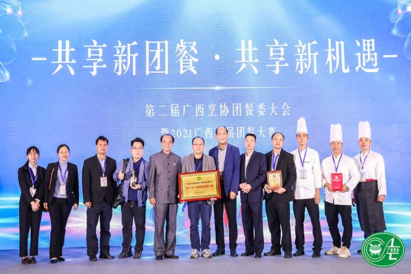 ??? 12月3-4日,自治區(qū)商務(wù)廳在南寧國家會展中心隆重舉辦了“2021廣西美食博覽會”,來自廣西各地市的600多家品牌餐飲企業(yè)的1000多名企業(yè)家和廚師參加了本次博覽會。同期召開了廣西烹飪餐飲行業(yè)協(xié)會七屆三次理事擴(kuò)大會,并舉辦了第十屆廣西民族地方(桂菜)特色美食大賽、廣西首屆烹飪工匠節(jié)暨第四屆名廚大會、廣西第二屆團(tuán)餐大會及首屆團(tuán)餐大賽。我公司獲得了“廣西餐飲管理標(biāo)桿企業(yè)”“2021年廣西團(tuán)餐品牌20強(qiáng)”、第十屆廣西民族地方(桂菜)特色美食大賽團(tuán)體賽特金獎、廣西首屆團(tuán)餐大賽特金獎等榮譽(yù),東苑餐廳經(jīng)理羅照才獲得了“2021年度廣西名廚大會金人獎”、“2021年度廣西名廚大會優(yōu)秀廚師獎”、“2021年度廣西名廚大會烹飪育人獎”等榮譽(yù)稱號。