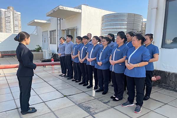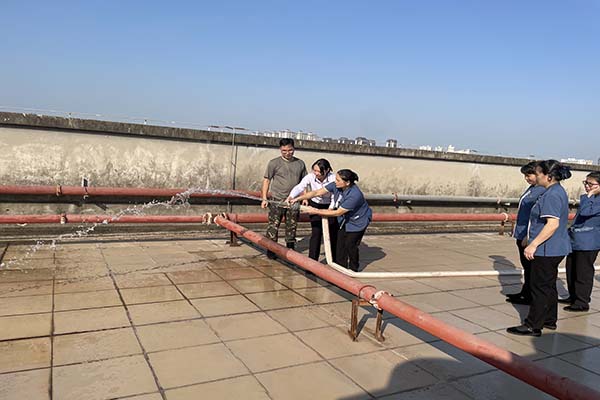 覃老師根據(jù)酒店的實際情況,向大家講解了火災(zāi)的預(yù)防措施、初期火災(zāi)撲救常識、疏散逃生知識及如何正確操作使用滅火器、水帶等基本常識,并現(xiàn)場示范指導(dǎo)使用滅火器和水帶。講解完畢,員工們依次實操使用滅火器和水帶,做到人人會用滅火器及水帶。