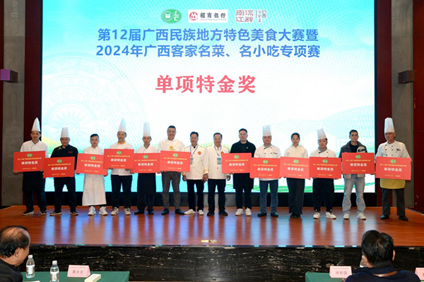 12月15日,第十二屆廣西民族地方特色美食大賽在南寧舉行,來自全區(qū)各市縣餐飲企業(yè)和職業(yè)院校選送的424個體現(xiàn)廣西桂菜四大風味及客家風味的美食品種參加了比賽。我司代表隊由東苑餐廳經(jīng)理羅照才率隊參加比賽,并斬獲團體特金獎1個、單項特金獎3個、單項金獎2個。其中:壯鄉(xiāng)粽子酥、茅魚露蝦、新派邕城紙包雞獲單項特金獎;五彩茉莉、形象玉米魚獲單項金獎。
